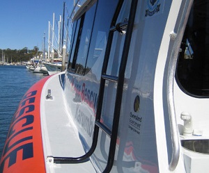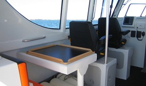 Seating is for helm and three crew plus sides seats aft. The dashboard is laid out to the crew’s specifications to accommodate their state of art electronics. There is a small galley forward portside with toilet on starboard side. Windows throughout the cabin give excellent visibility and suspension seating provides a comfortable ride for crew. A 2.5 Naiad tender is situated aft for easy launching to attend inshore rescues.